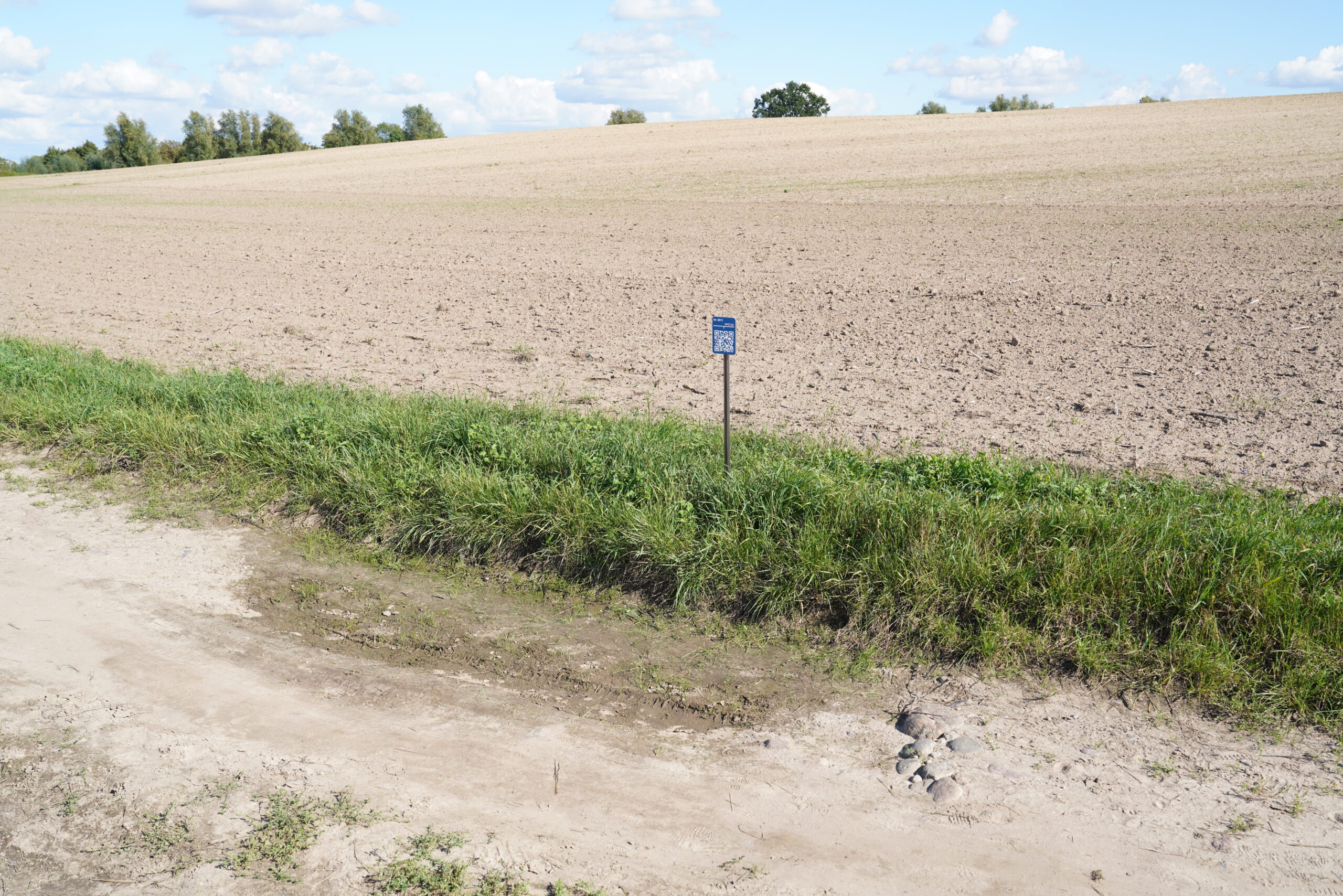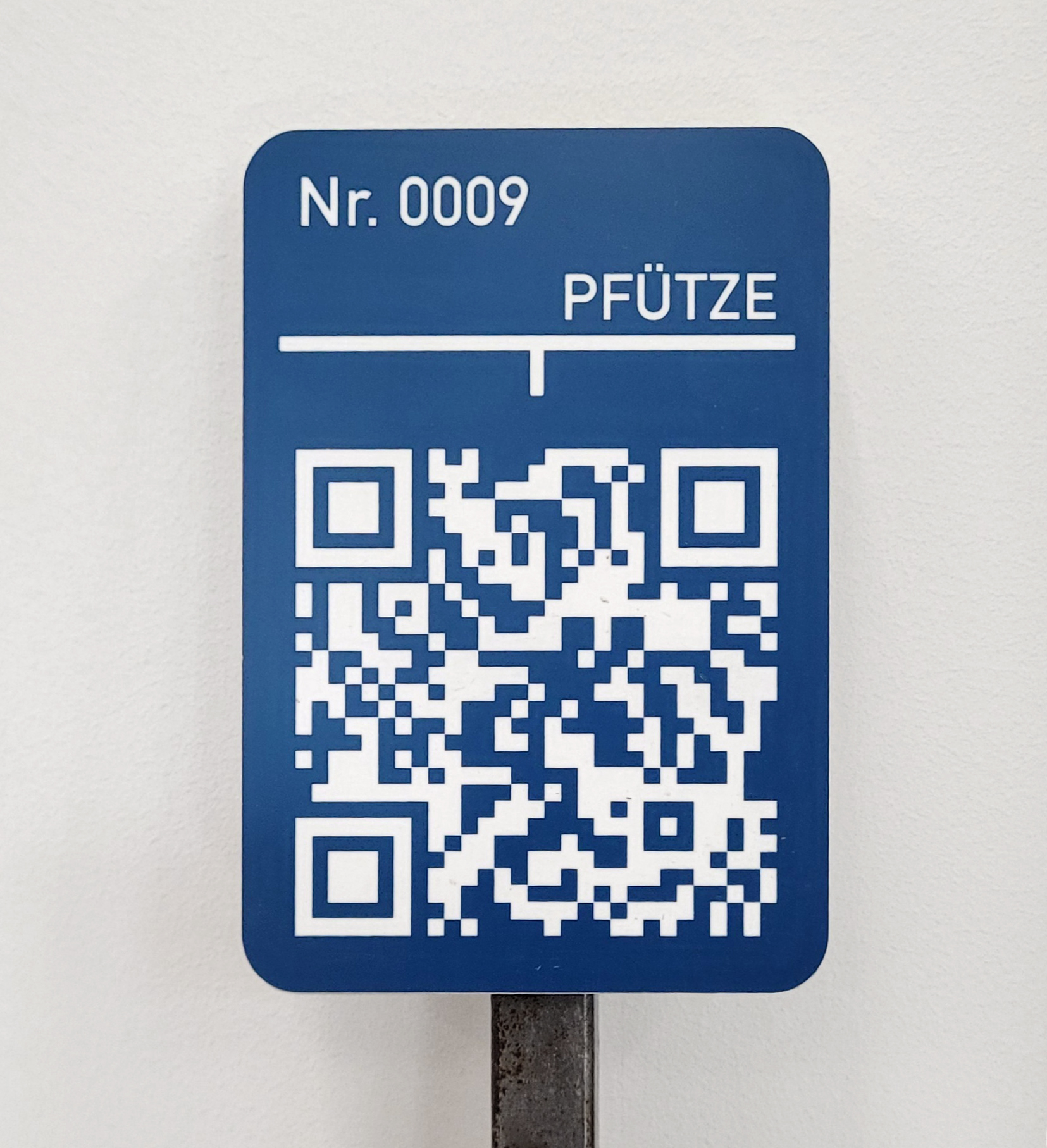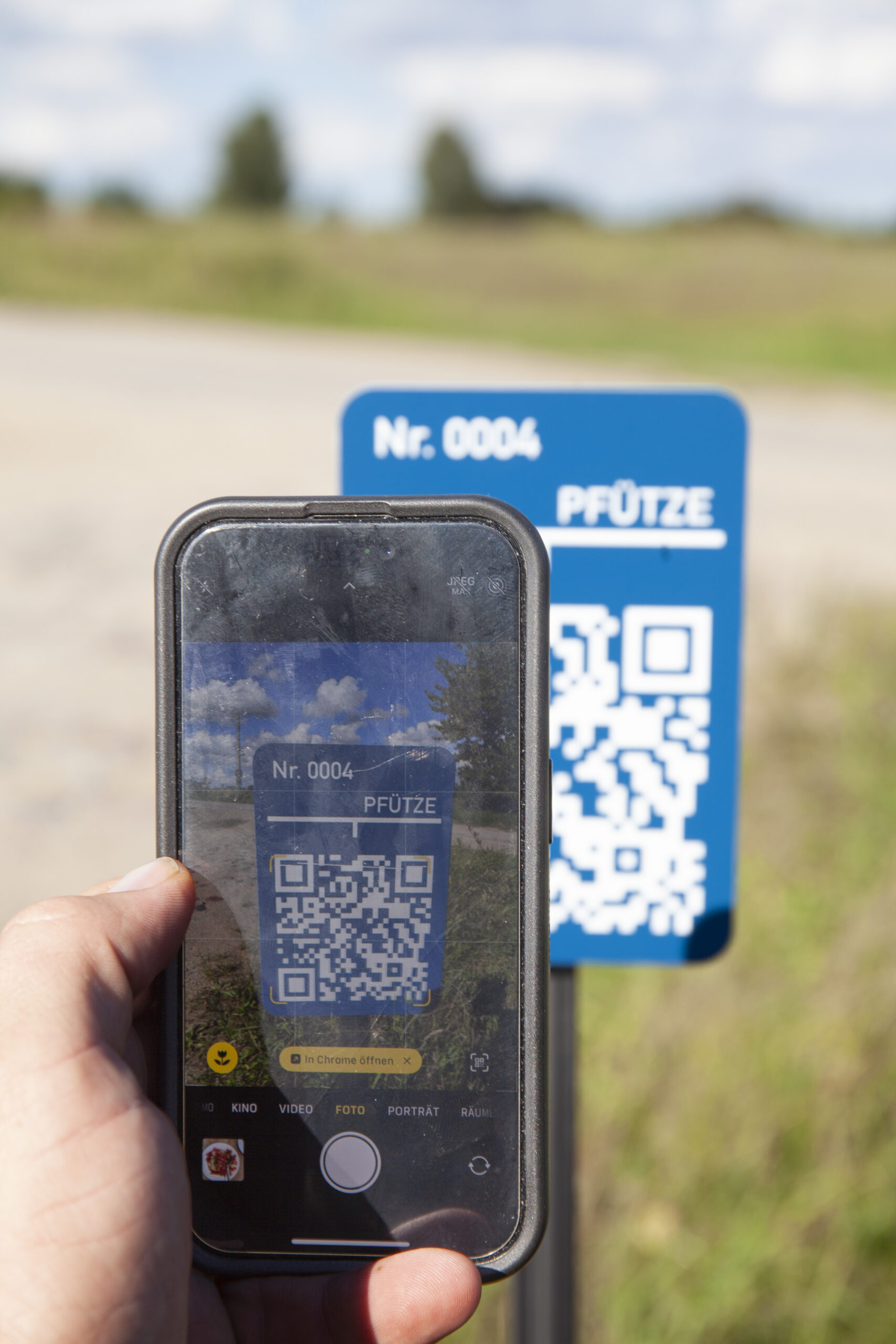 The work documents puddles around Lake Wrietzensee, Germany: they were observed, map- ped, and classified into three categories — short-lived, medium-term, and persistent Along the route, blue signs mark the former locations of puddles. Each sign bears a number and a QR code linking to a documentary image of the puddle. The signs serve both as an informational infrastructure and as a monument to this fleeting body of water.
